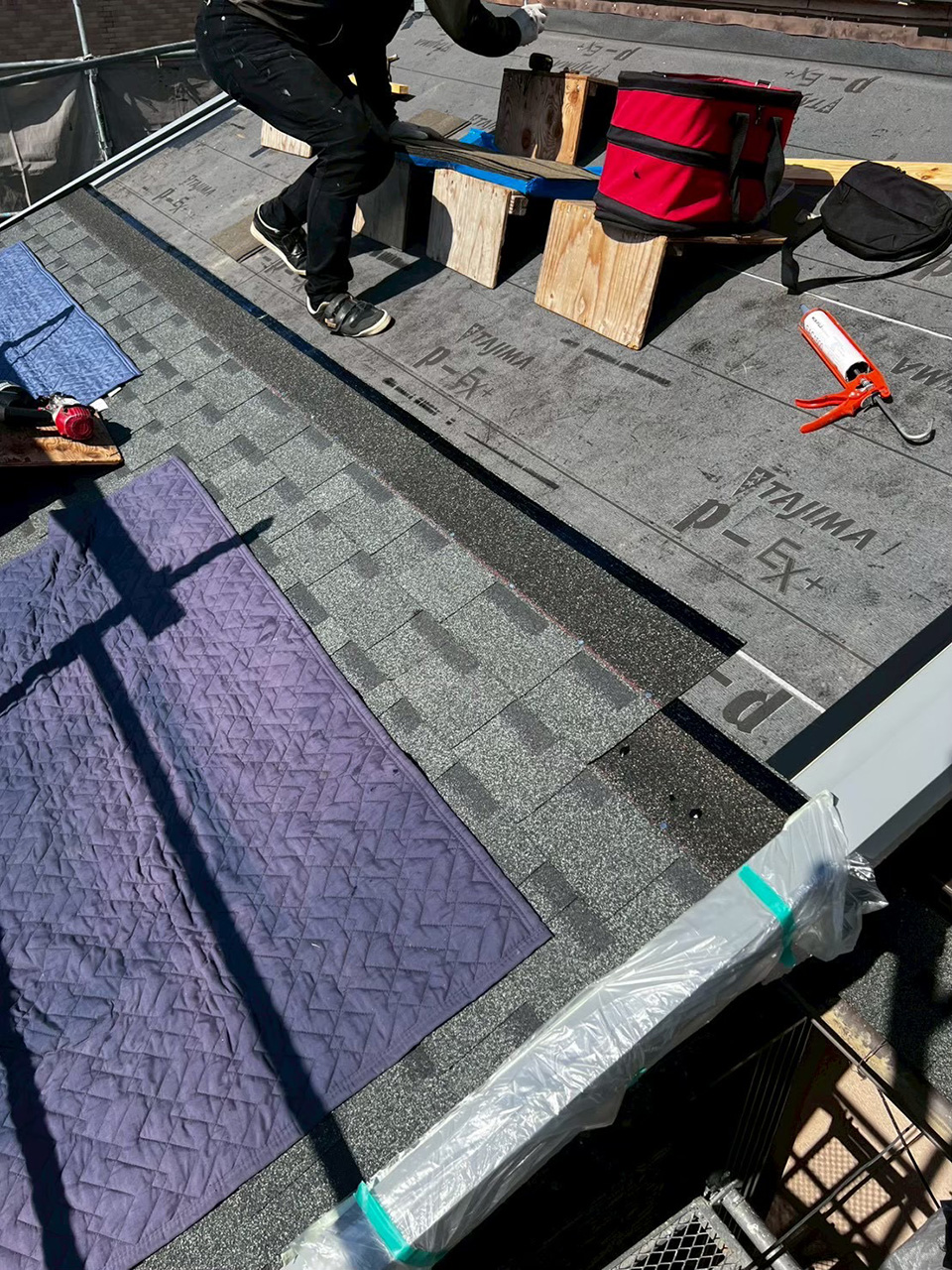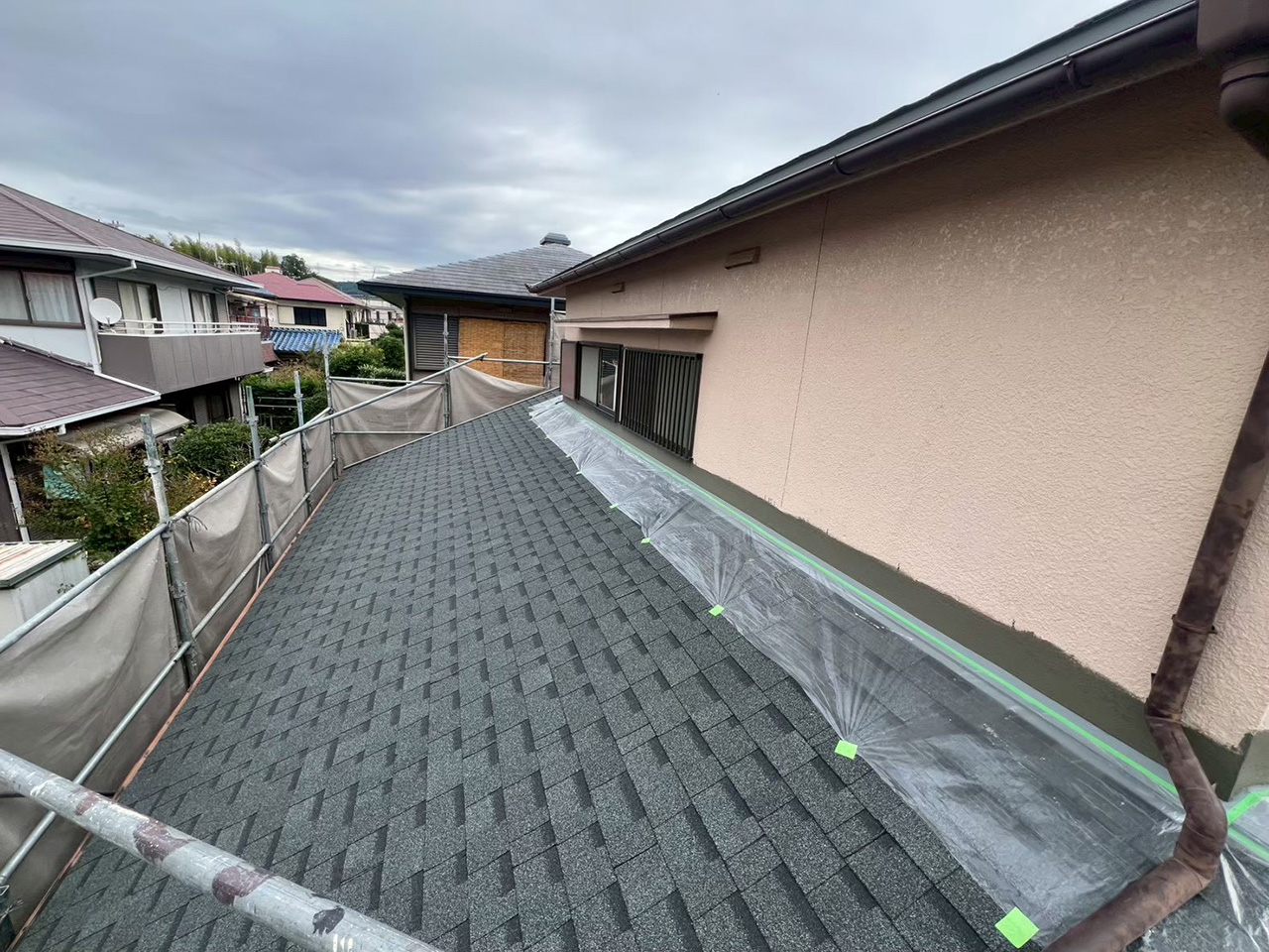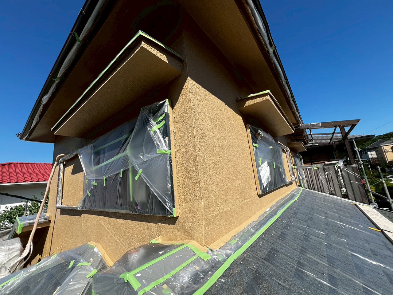 右:外壁のタイル部分を養生している様子。