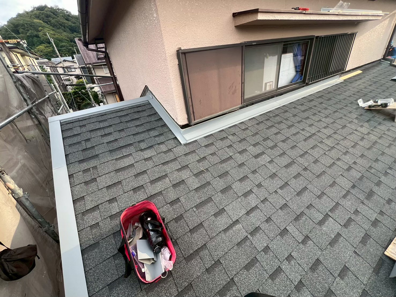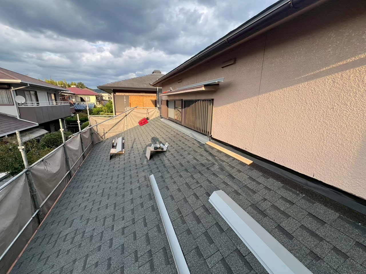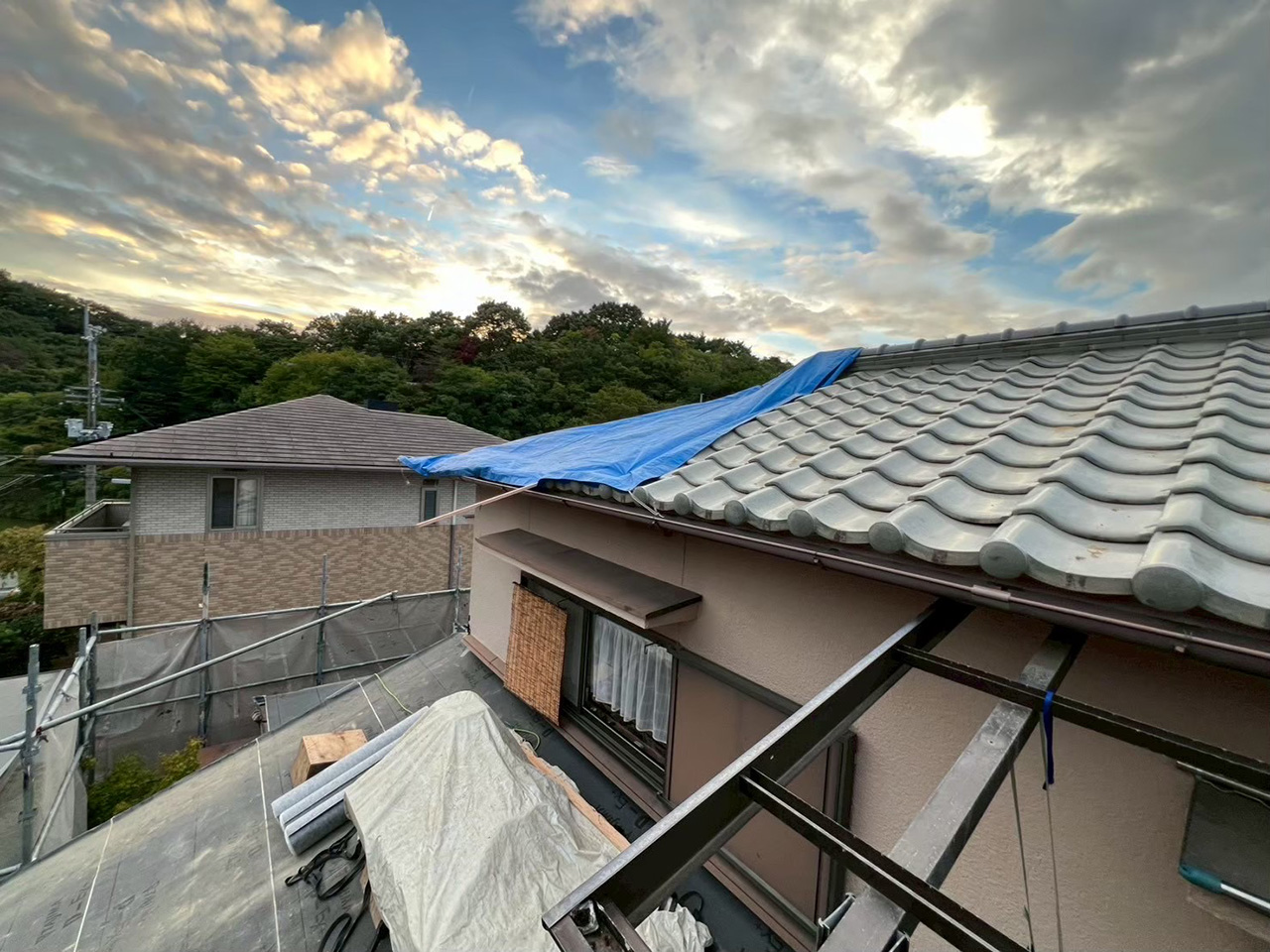 右:外壁のタイル部分を養生している様子。