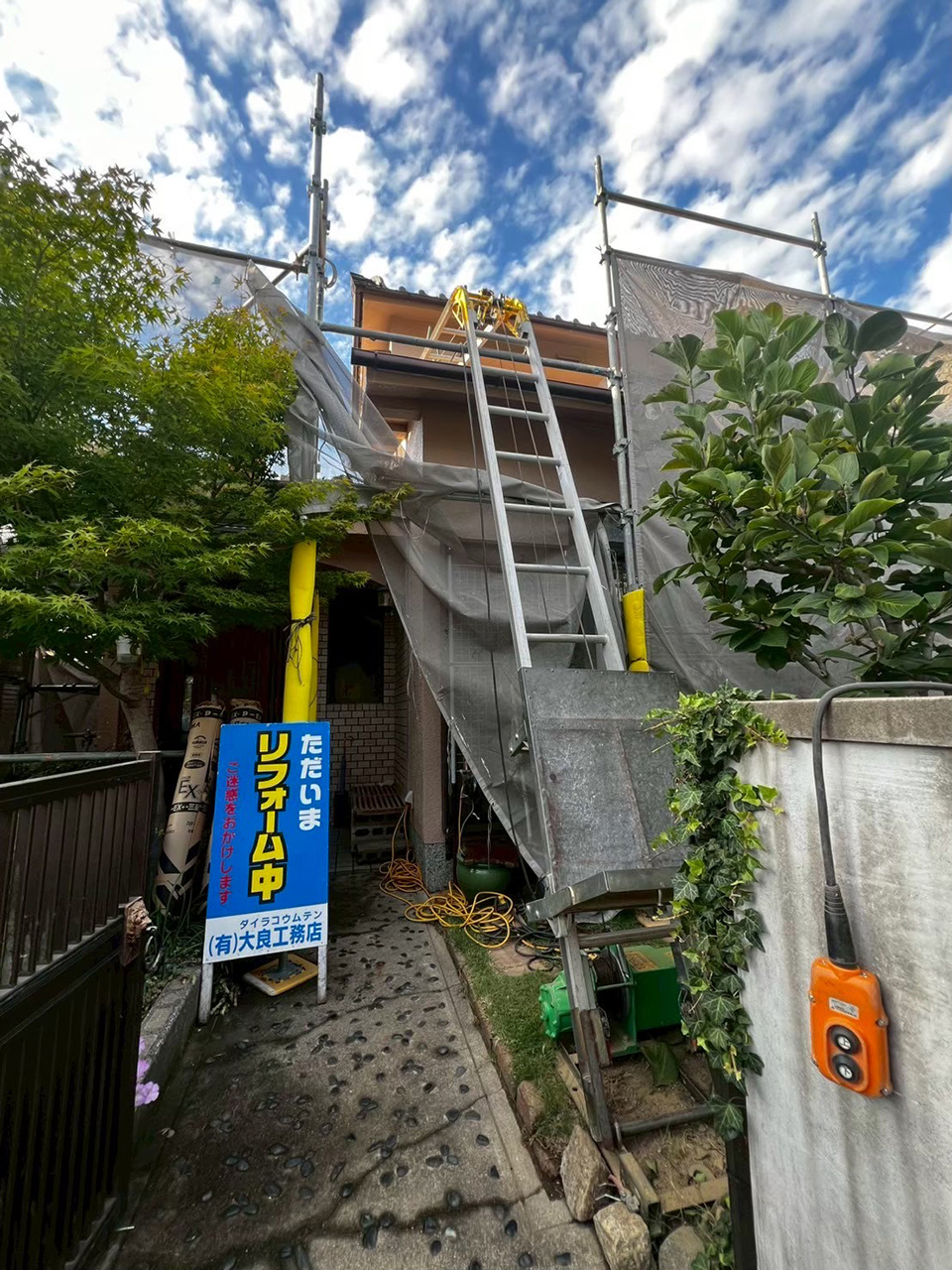 足場を架ける前。建物正面に大きな木があり、今回 この木を切って欲しいとお願いされました。