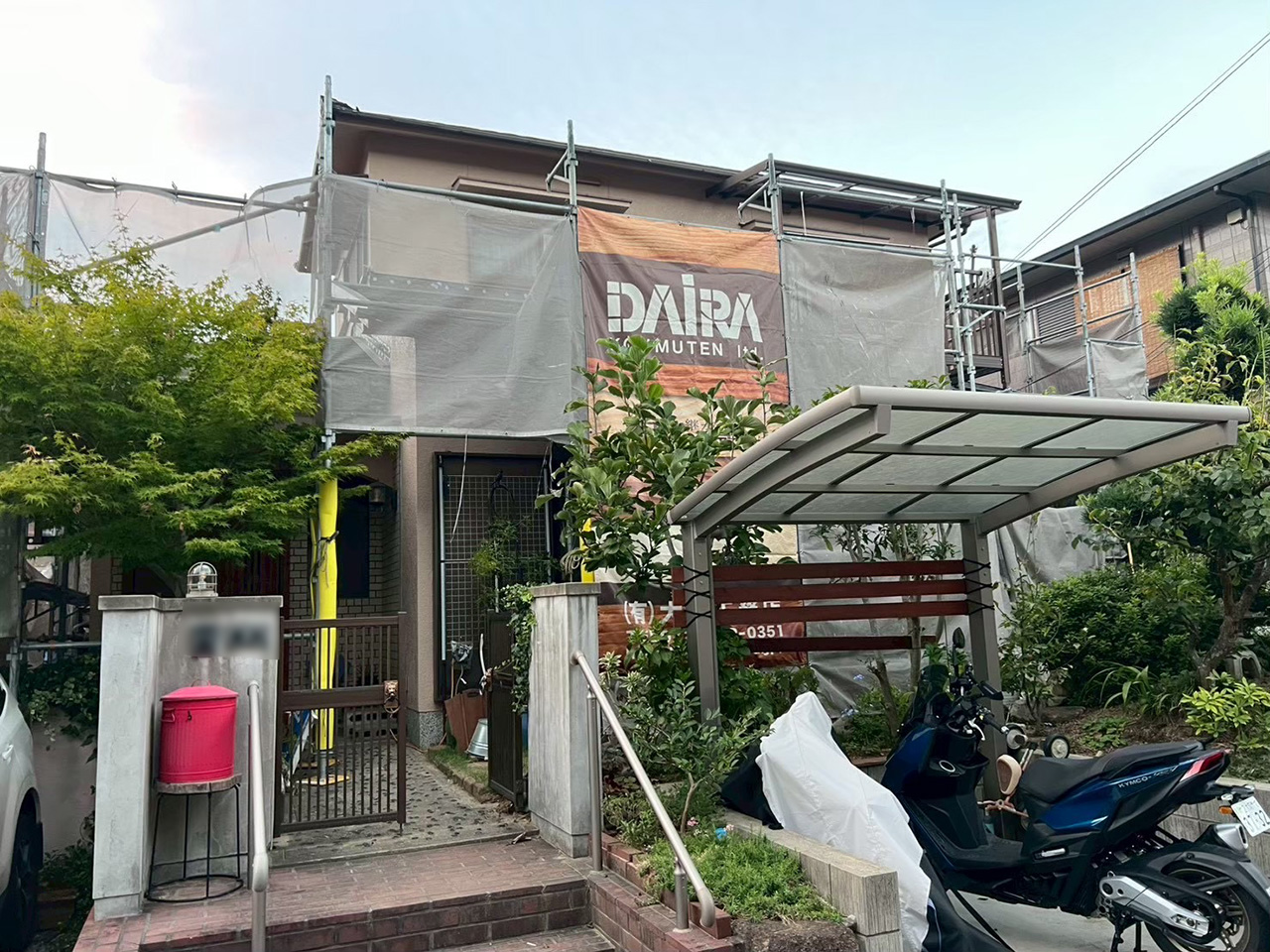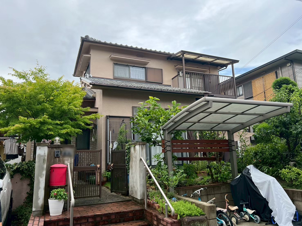足場を架ける前にカーポートと2Fベランダの屋根を外してあります。(塗装完了後再取付)