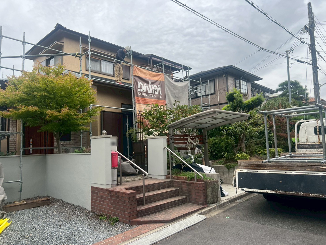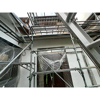外壁足場を架けてメッシュシートを掛けている様子。 先に高圧洗浄で外壁を洗います。