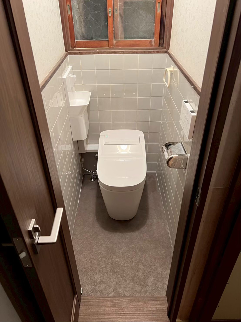 手洗側の壁クロスとトイレ背面の壁クロスは同色。ブラウン系でまとめてあるので、